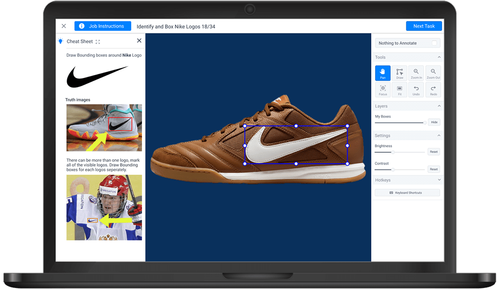 - Center: Main annotation canvas with task image draggable and resizable bounding boxes.